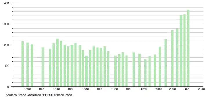 L'évolution du nombre d'habitants est connue à travers les recensements de la population effectués dans la commune depuis 1793. Pour les communes de moins de 10 000 habitants, une enquête de recensement portant sur toute la population est réalisée tous les cinq ans, les populations légales des années intermédiaires étant quant à elles estimées par interpolation ou extrapolation[26]. Pour la commune, le premier recensement exhaustif entrant dans le cadre du nouveau dispositif a été réalisé en 2006[27].