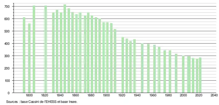 L'évolution du nombre d'habitants est connue à travers les recensements de la population effectués dans la commune depuis 1793. Pour les communes de moins de 10 000 habitants, une enquête de recensement portant sur toute la population est réalisée tous les cinq ans, les populations légales des années intermédiaires étant quant à elles estimées par interpolation ou extrapolation[26]. Pour la commune, le premier recensement exhaustif entrant dans le cadre du nouveau dispositif a été réalisé en 2007[27].