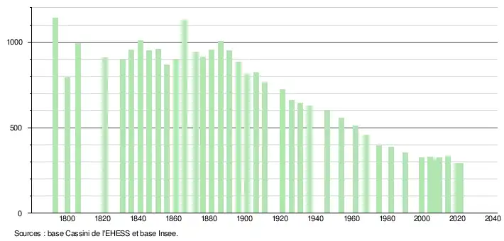 L'évolution du nombre d'habitants est connue à travers les recensements de la population effectués dans la commune depuis 1793. Pour les communes de moins de 10 000 habitants, une enquête de recensement portant sur toute la population est réalisée tous les cinq ans, les populations légales des années intermédiaires étant quant à elles estimées par interpolation ou extrapolation[12]. Pour la commune, le premier recensement exhaustif entrant dans le cadre du nouveau dispositif a été réalisé en 2004[13].