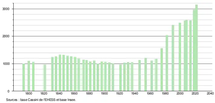 L'évolution du nombre d'habitants est connue à travers les recensements de la population effectués dans la commune depuis 1793. Pour les communes de moins de 10 000 habitants, une enquête de recensement portant sur toute la population est réalisée tous les cinq ans, les populations légales des années intermédiaires étant quant à elles estimées par interpolation ou extrapolation[27]. Pour la commune, le premier recensement exhaustif entrant dans le cadre du nouveau dispositif a été réalisé en 2008[28].