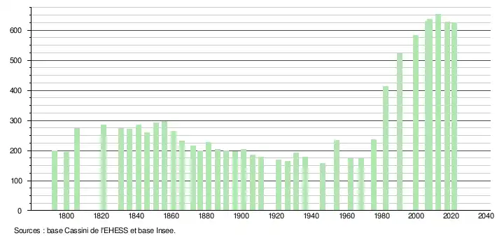 L'évolution du nombre d'habitants est connue à travers les recensements de la population effectués dans la commune depuis 1793. Pour les communes de moins de 10 000 habitants, une enquête de recensement portant sur toute la population est réalisée tous les cinq ans, les populations légales des années intermédiaires étant quant à elles estimées par interpolation ou extrapolation[44]. Pour la commune, le premier recensement exhaustif entrant dans le cadre du nouveau dispositif a été réalisé en 2007[45].