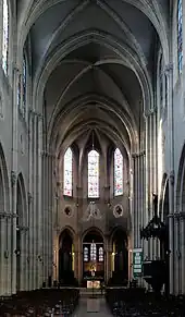 Le vaisseau central est flanqué de deux collatéraux et de chapelles latérales. Le mobilier — autels, baptistère, confessionnaux, portes — a été dessiné par Lassus.