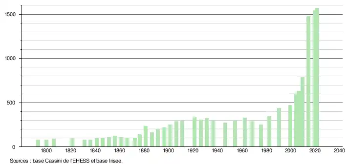 L'évolution du nombre d'habitants est connue à travers les recensements de la population effectués dans la commune depuis 1793. Pour les communes de moins de 10 000 habitants, une enquête de recensement portant sur toute la population est réalisée tous les cinq ans, les populations légales des années intermédiaires étant quant à elles estimées par interpolation ou extrapolation[33]. Pour la commune, le premier recensement exhaustif entrant dans le cadre du nouveau dispositif a été réalisé en 2004[34].