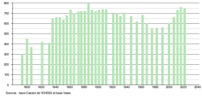 L'évolution du nombre d'habitants est connue à travers les recensements de la population effectués dans la commune depuis 1793. Pour les communes de moins de 10 000 habitants, une enquête de recensement portant sur toute la population est réalisée tous les cinq ans, les populations légales des années intermédiaires étant quant à elles estimées par interpolation ou extrapolation[33]. Pour la commune, le premier recensement exhaustif entrant dans le cadre du nouveau dispositif a été réalisé en 2006[34].