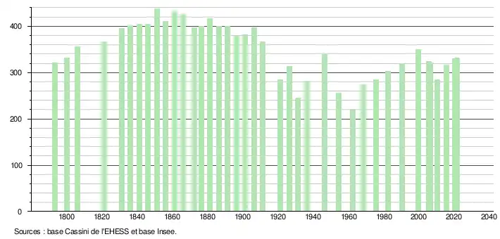 L'évolution du nombre d'habitants est connue à travers les recensements de la population effectués dans la commune depuis 1793. Pour les communes de moins de 10 000 habitants, une enquête de recensement portant sur toute la population est réalisée tous les cinq ans, les populations légales des années intermédiaires étant quant à elles estimées par interpolation ou extrapolation[19]. Pour la commune, le premier recensement exhaustif entrant dans le cadre du nouveau dispositif a été réalisé en 2005[20].