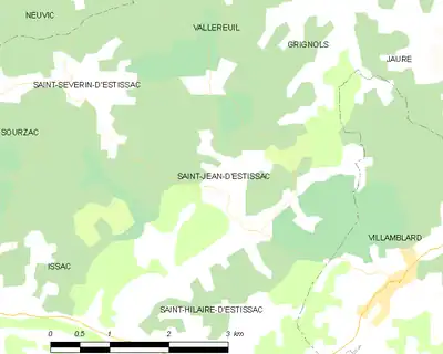 Saint-Jean-d'Estissac est limitrophe de six autres communes. Au nord-est, son territoire est distant de moins de 400 mètres de celui de Jaure.