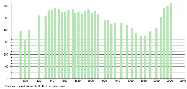 L'évolution du nombre d'habitants est connue à travers les recensements de la population effectués dans la commune depuis 1793. Pour les communes de moins de 10 000 habitants, une enquête de recensement portant sur toute la population est réalisée tous les cinq ans, les populations légales des années intermédiaires étant quant à elles estimées par interpolation ou extrapolation[20]. Pour la commune, le premier recensement exhaustif entrant dans le cadre du nouveau dispositif a été réalisé en 2006[21].