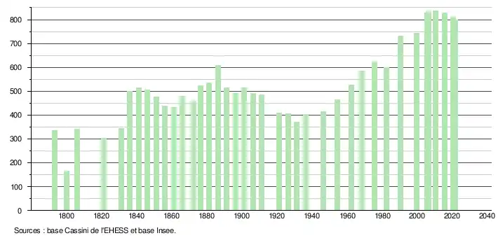 L'évolution du nombre d'habitants est connue à travers les recensements de la population effectués dans la commune depuis 1793. Pour les communes de moins de 10 000 habitants, une enquête de recensement portant sur toute la population est réalisée tous les cinq ans, les populations légales des années intermédiaires étant quant à elles estimées par interpolation ou extrapolation[19]. Pour la commune, le premier recensement exhaustif entrant dans le cadre du nouveau dispositif a été réalisé en 2005[20].