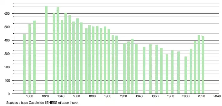 L'évolution du nombre d'habitants est connue à travers les recensements de la population effectués dans la commune depuis 1793. Pour les communes de moins de 10 000 habitants, une enquête de recensement portant sur toute la population est réalisée tous les cinq ans, les populations légales des années intermédiaires étant quant à elles estimées par interpolation ou extrapolation[28]. Pour la commune, le premier recensement exhaustif entrant dans le cadre du nouveau dispositif a été réalisé en 2006[29].