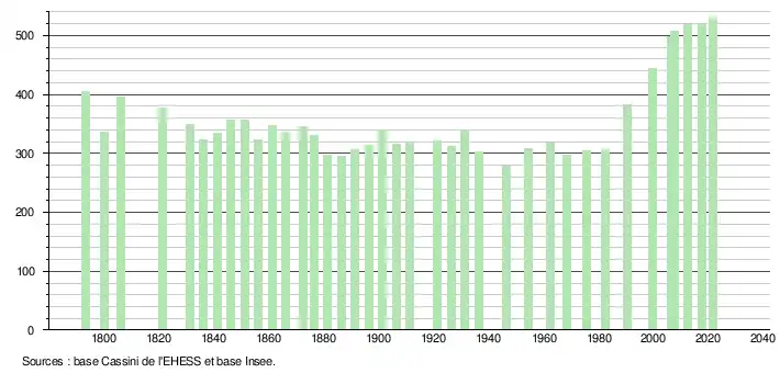 L'évolution du nombre d'habitants est connue à travers les recensements de la population effectués dans la commune depuis 1793. Pour les communes de moins de 10 000 habitants, une enquête de recensement portant sur toute la population est réalisée tous les cinq ans, les populations légales des années intermédiaires étant quant à elles estimées par interpolation ou extrapolation[20]. Pour la commune, le premier recensement exhaustif entrant dans le cadre du nouveau dispositif a été réalisé en 2007[21].