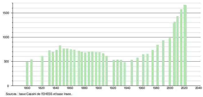 L'évolution du nombre d'habitants est connue à travers les recensements de la population effectués dans la commune depuis 1800. Pour les communes de moins de 10 000 habitants, une enquête de recensement portant sur toute la population est réalisée tous les cinq ans, les populations légales des années intermédiaires étant quant à elles estimées par interpolation ou extrapolation[21]. Pour la commune, le premier recensement exhaustif entrant dans le cadre du nouveau dispositif a été réalisé en 2005[22].