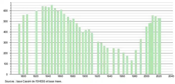 L'évolution du nombre d'habitants est connue à travers les recensements de la population effectués dans la commune depuis 1793. Pour les communes de moins de 10 000 habitants, une enquête de recensement portant sur toute la population est réalisée tous les cinq ans, les populations légales des années intermédiaires étant quant à elles estimées par interpolation ou extrapolation[16]. Pour la commune, le premier recensement exhaustif entrant dans le cadre du nouveau dispositif a été réalisé en 2004[17].