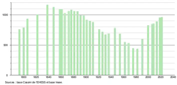 L'évolution du nombre d'habitants est connue à travers les recensements de la population effectués dans la commune depuis 1793. Pour les communes de moins de 10 000 habitants, une enquête de recensement portant sur toute la population est réalisée tous les cinq ans, les populations légales des années intermédiaires étant quant à elles estimées par interpolation ou extrapolation[13]. Pour la commune, le premier recensement exhaustif entrant dans le cadre du nouveau dispositif a été réalisé en 2008[14].