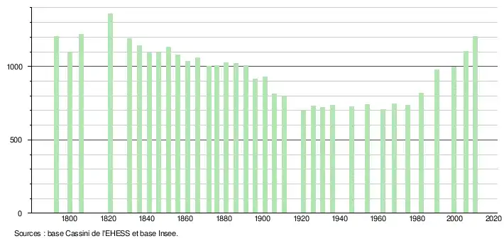 2. Dans le tableau des recensements et le graphique, par convention dans Wikipédia, le principe a été retenu, pour les populations légales postérieures à 1999 de n’afficher dans le tableau des recensements et le graphique que les populations correspondant à l'année 2006, première population légale publiée calculée conformément aux concepts définis dans le décret no 2003-485 du 5 juin 2003, et les années correspondant à une enquête exhaustive de recensement pour les communes de moins de 10 000 habitants, ainsi que la dernière population légale publiée par l’Insee.