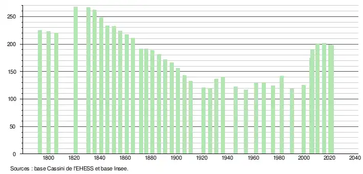 L'évolution du nombre d'habitants est connue à travers les recensements de la population effectués dans la commune depuis 1793. Pour les communes de moins de 10 000 habitants, une enquête de recensement portant sur toute la population est réalisée tous les cinq ans, les populations légales des années intermédiaires étant quant à elles estimées par interpolation ou extrapolation[22]. Pour la commune, le premier recensement exhaustif entrant dans le cadre du nouveau dispositif a été réalisé en 2005[23].