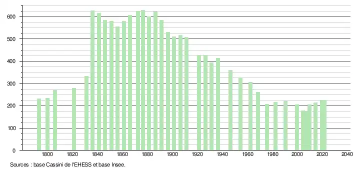 L'évolution du nombre d'habitants est connue à travers les recensements de la population effectués dans la commune depuis 1793. Pour les communes de moins de 10 000 habitants, une enquête de recensement portant sur toute la population est réalisée tous les cinq ans, les populations légales des années intermédiaires étant quant à elles estimées par interpolation ou extrapolation[35]. Pour la commune, le premier recensement exhaustif entrant dans le cadre du nouveau dispositif a été réalisé en 2004[36].
