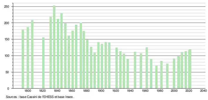 L'évolution du nombre d'habitants est connue à travers les recensements de la population effectués dans la commune depuis 1793. Pour les communes de moins de 10 000 habitants, une enquête de recensement portant sur toute la population est réalisée tous les cinq ans, les populations légales des années intermédiaires étant quant à elles estimées par interpolation ou extrapolation[27]. Pour la commune, le premier recensement exhaustif entrant dans le cadre du nouveau dispositif a été réalisé en 2005[28].