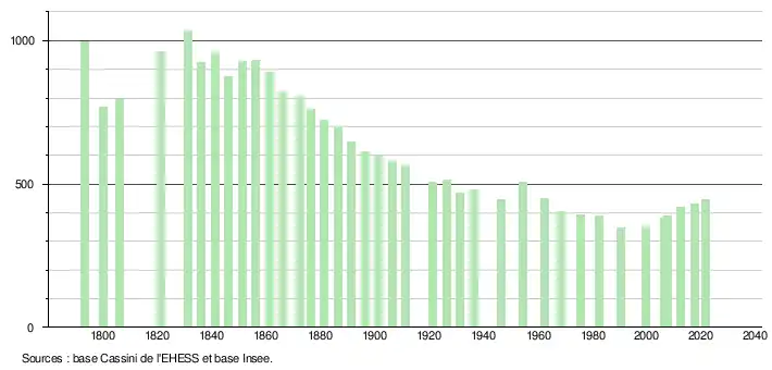 Le nombre d'exploitations agricoles en activité et ayant leur siège dans la commune est passé de 42 lors du recensement agricole de 1988[Note 14] à 29 en 2000 puis à 22 en 2010[34] et enfin à 23 en 2020[Carte 6], soit une baisse de 45 % en 32 ans. Le même mouvement est observé à l'échelle du département qui a perdu pendant cette période 58 % de ses exploitations[35],[Carte 7]. La surface agricole utilisée sur la commune a quant à elle augmenté, passant de 1 522 ha en 1988 à 1 748 ha en 2020[Carte 8]. Parallèlement la surface agricole utilisée moyenne par exploitation a augmenté, passant de 36 à 76 ha[34].