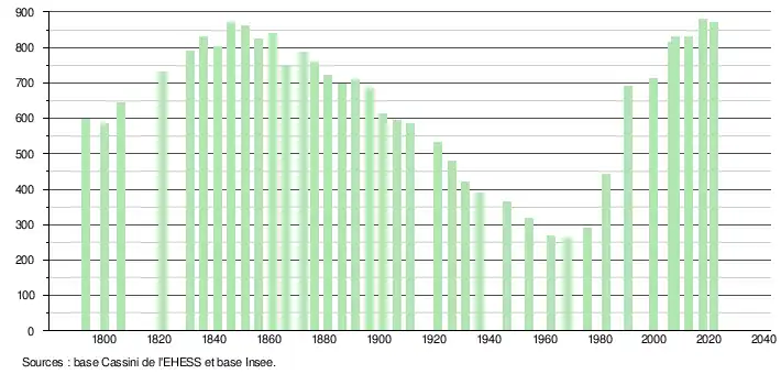 L'évolution du nombre d'habitants est connue à travers les recensements de la population effectués dans la commune depuis 1793. Pour les communes de moins de 10 000 habitants, une enquête de recensement portant sur toute la population est réalisée tous les cinq ans, les populations légales des années intermédiaires étant quant à elles estimées par interpolation ou extrapolation[20]. Pour la commune, le premier recensement exhaustif entrant dans le cadre du nouveau dispositif a été réalisé en 2007[21].