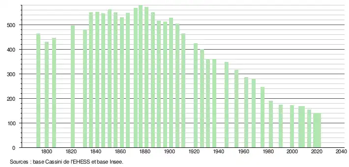 L'évolution du nombre d'habitants est connue à travers les recensements de la population effectués dans la commune depuis 1793. Pour les communes de moins de 10 000 habitants, une enquête de recensement portant sur toute la population est réalisée tous les cinq ans, les populations légales des années intermédiaires étant quant à elles estimées par interpolation ou extrapolation[33]. Pour la commune, le premier recensement exhaustif entrant dans le cadre du nouveau dispositif a été réalisé en 2008[34].
