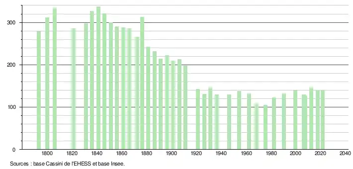 L'évolution du nombre d'habitants est connue à travers les recensements de la population effectués dans la commune depuis 1793. Pour les communes de moins de 10 000 habitants, une enquête de recensement portant sur toute la population est réalisée tous les cinq ans, les populations légales des années intermédiaires étant quant à elles estimées par interpolation ou extrapolation[16]. Pour la commune, le premier recensement exhaustif entrant dans le cadre du nouveau dispositif a été réalisé en 2007[17].