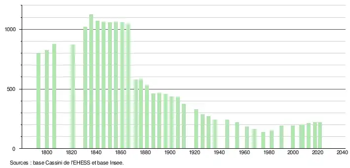 L'évolution du nombre d'habitants est connue à travers les recensements de la population effectués dans la commune depuis 1793. Pour les communes de moins de 10 000 habitants, une enquête de recensement portant sur toute la population est réalisée tous les cinq ans, les populations légales des années intermédiaires étant quant à elles estimées par interpolation ou extrapolation[29]. Pour la commune, le premier recensement exhaustif entrant dans le cadre du nouveau dispositif a été réalisé en 2007[30].