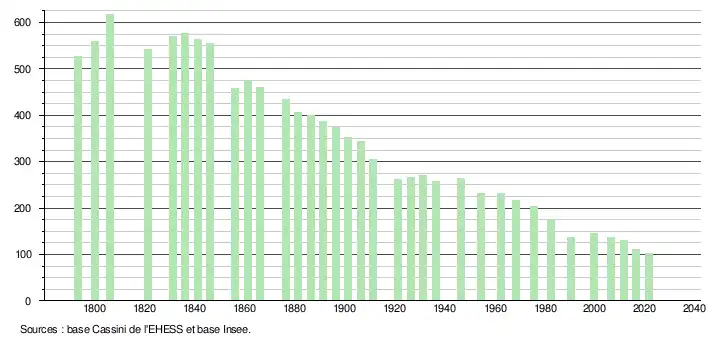 L'évolution du nombre d'habitants est connue à travers les recensements de la population effectués dans la commune depuis 1793. Pour les communes de moins de 10 000 habitants, une enquête de recensement portant sur toute la population est réalisée tous les cinq ans, les populations légales des années intermédiaires étant quant à elles estimées par interpolation ou extrapolation[27]. Pour la commune, le premier recensement exhaustif entrant dans le cadre du nouveau dispositif a été réalisé en 2006[28].