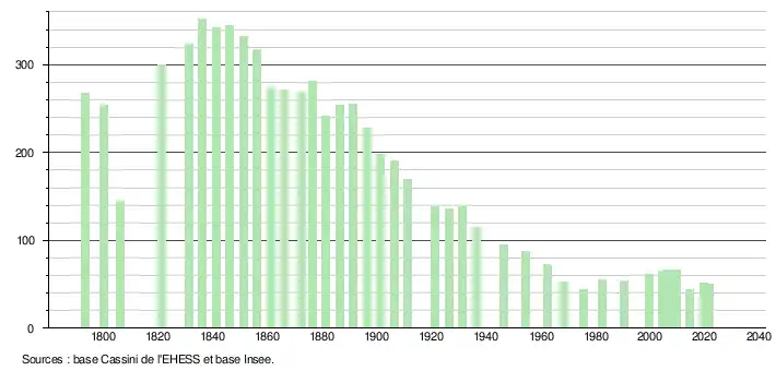 L'évolution du nombre d'habitants est connue à travers les recensements de la population effectués dans la commune depuis 1793. Pour les communes de moins de 10 000 habitants, une enquête de recensement portant sur toute la population est réalisée tous les cinq ans, les populations légales des années intermédiaires étant quant à elles estimées par interpolation ou extrapolation[23]. Pour la commune, le premier recensement exhaustif entrant dans le cadre du nouveau dispositif a été réalisé en 2004[24].