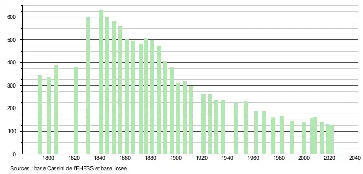 | L'évolution du nombre d'habitants est connue à travers les recensements de la population effectués dans la commune depuis 1793. Pour les communes de moins de 10 000 habitants, une enquête de recensement portant sur toute la population est réalisée tous les cinq ans, les populations légales des années intermédiaires étant quant à elles estimées par interpolation ou extrapolation[24]. Pour la commune, le premier recensement exhaustif entrant dans le cadre du nouveau dispositif a été réalisé en 2008[25]. En 2021, la commune comptait 127 habitants[Note 3], en diminution de 6,62 % par rapport à 2015 (Gers : +0,79 %, France hors Mayotte : +1,84 %). |