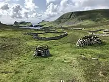 L'archipel a été continuellement habité depuis au moins deux millénaires, de l'Âge du bronze au XXe siècle[36]. Dernièrement, une preuve directe d'un peuplement plus ancien remontant au Néolithique fut apportée par des tessons de poterie trouvés à l'est du village ; ces vestiges sont du même style que les céramiques des Hébrides. La découverte consécutive d'une carrière de pierre sur Mullach Sgar, au-dessus de Village Bay, entraîna la mise au jour de nombreux outils lithiques : socs de houe, pierres à aiguiser[note 7] et couteaux de Skaill[note 8]. Ces outils furent trouvés dans un cleitean, bâtiment en pierre (voir ci-contre) servant à entreposer des objets.