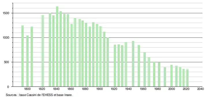L'évolution du nombre d'habitants est connue à travers les recensements de la population effectués dans la commune depuis 1793. Pour les communes de moins de 10 000 habitants, une enquête de recensement portant sur toute la population est réalisée tous les cinq ans, les populations légales des années intermédiaires étant quant à elles estimées par interpolation ou extrapolation[19]. Pour la commune, le premier recensement exhaustif entrant dans le cadre du nouveau dispositif a été réalisé en 2006[20].