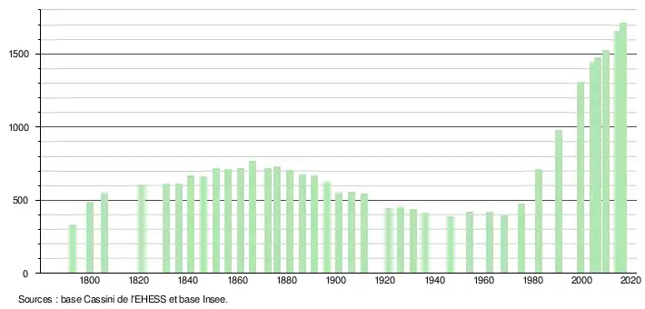 L'évolution du nombre d'habitants est connue à travers les recensements de la population effectués dans la commune depuis 1793. Pour les communes de moins de 10 000 habitants, une enquête de recensement portant sur toute la population est réalisée tous les cinq ans, les populations légales des années intermédiaires étant quant à elles estimées par interpolation ou extrapolation[9]. Pour la commune, le premier recensement exhaustif entrant dans le cadre du nouveau dispositif a été réalisé en 2004[10].