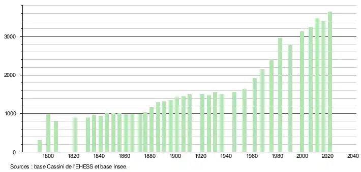 L'évolution du nombre d'habitants est connue à travers les recensements de la population effectués dans la commune depuis 1793. Pour les communes de moins de 10 000 habitants, une enquête de recensement portant sur toute la population est réalisée tous les cinq ans, les populations légales des années intermédiaires étant quant à elles estimées par interpolation ou extrapolation[28]. Pour la commune, le premier recensement exhaustif entrant dans le cadre du nouveau dispositif a été réalisé en 2006[29].