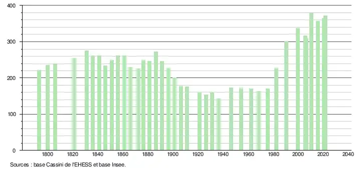 L'évolution du nombre d'habitants est connue à travers les recensements de la population effectués dans la commune depuis 1793. Pour les communes de moins de 10 000 habitants, une enquête de recensement portant sur toute la population est réalisée tous les cinq ans, les populations légales des années intermédiaires étant quant à elles estimées par interpolation ou extrapolation[21]. Pour la commune, le premier recensement exhaustif entrant dans le cadre du nouveau dispositif a été réalisé en 2005[22].