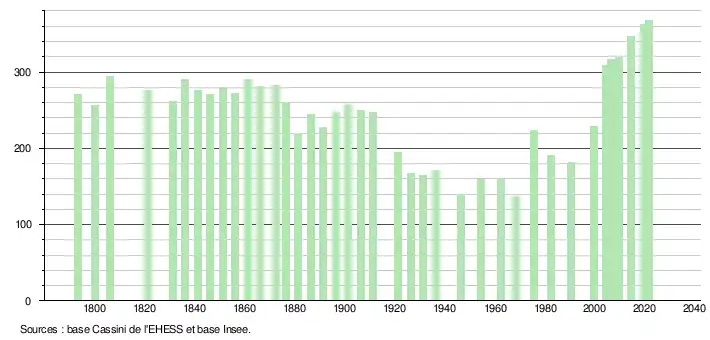 L'évolution du nombre d'habitants est connue à travers les recensements de la population effectués dans la commune depuis 1793. Pour les communes de moins de 10 000 habitants, une enquête de recensement portant sur toute la population est réalisée tous les cinq ans, les populations légales des années intermédiaires étant quant à elles estimées par interpolation ou extrapolation[17]. Pour la commune, le premier recensement exhaustif entrant dans le cadre du nouveau dispositif a été réalisé en 2004[18].
