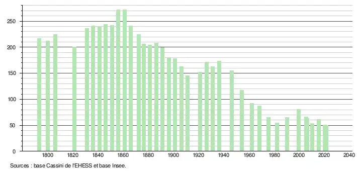 L'évolution du nombre d'habitants est connue à travers les recensements de la population effectués dans la commune depuis 1793. Pour les communes de moins de 10 000 habitants, une enquête de recensement portant sur toute la population est réalisée tous les cinq ans, les populations légales des années intermédiaires étant quant à elles estimées par interpolation ou extrapolation[16]. Pour la commune, le premier recensement exhaustif entrant dans le cadre du nouveau dispositif a été réalisé en 2005[17].
