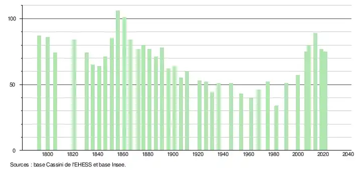 L'évolution du nombre d'habitants est connue à travers les recensements de la population effectués dans la commune depuis 1793. Pour les communes de moins de 10 000 habitants, une enquête de recensement portant sur toute la population est réalisée tous les cinq ans, les populations légales des années intermédiaires étant quant à elles estimées par interpolation ou extrapolation[26]. Pour la commune, le premier recensement exhaustif entrant dans le cadre du nouveau dispositif a été réalisé en 2008[27].