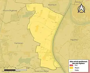 Le retrait-gonflement des sols argileux est susceptible d'engendrer des dommages importants aux bâtiments en cas d’alternance de périodes de sécheresse et de pluie[19]. La totalité de la commune est en aléa moyen ou fort (91,8 % au niveau départemental et 48,5 % au niveau national)[Carte 2]. Depuis le , en application de la loi ELAN, différentes contraintes s'imposent aux vendeurs, maîtres d'ouvrages ou constructeurs de biens situés dans une zone classée en aléa moyen ou fort[Note 3],[20].