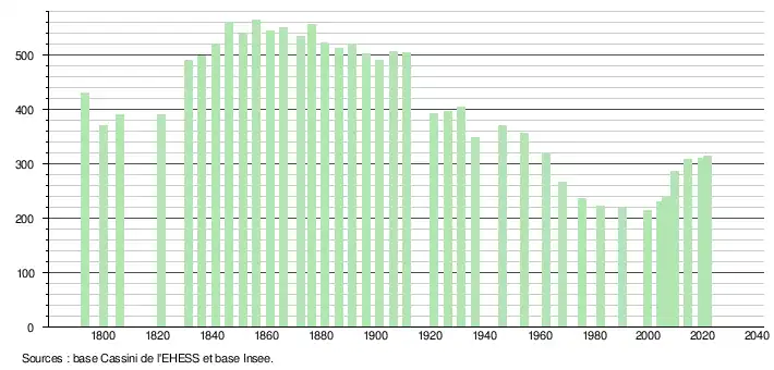 L'évolution du nombre d'habitants est connue à travers les recensements de la population effectués dans la commune depuis 1793. Pour les communes de moins de 10 000 habitants, une enquête de recensement portant sur toute la population est réalisée tous les cinq ans, les populations légales des années intermédiaires étant quant à elles estimées par interpolation ou extrapolation[20]. Pour la commune, le premier recensement exhaustif entrant dans le cadre du nouveau dispositif a été réalisé en 2004[21].