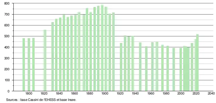 L'évolution du nombre d'habitants est connue à travers les recensements de la population effectués dans la commune depuis 1793. Pour les communes de moins de 10 000 habitants, une enquête de recensement portant sur toute la population est réalisée tous les cinq ans, les populations légales des années intermédiaires étant quant à elles estimées par interpolation ou extrapolation[29]. Pour la commune, le premier recensement exhaustif entrant dans le cadre du nouveau dispositif a été réalisé en 2004[30].