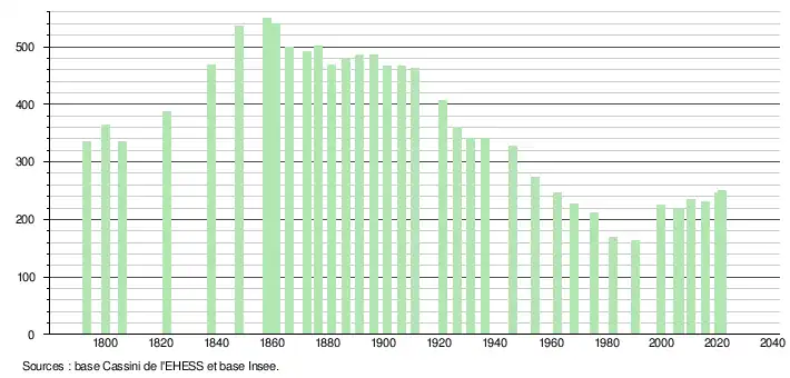 L'évolution du nombre d'habitants est connue à travers les recensements de la population effectués dans la commune depuis 1793. Pour les communes de moins de 10 000 habitants, une enquête de recensement portant sur toute la population est réalisée tous les cinq ans, les populations légales des années intermédiaires étant quant à elles estimées par interpolation ou extrapolation[8]. Pour la commune, le premier recensement exhaustif entrant dans le cadre du nouveau dispositif a été réalisé en 2005[9].