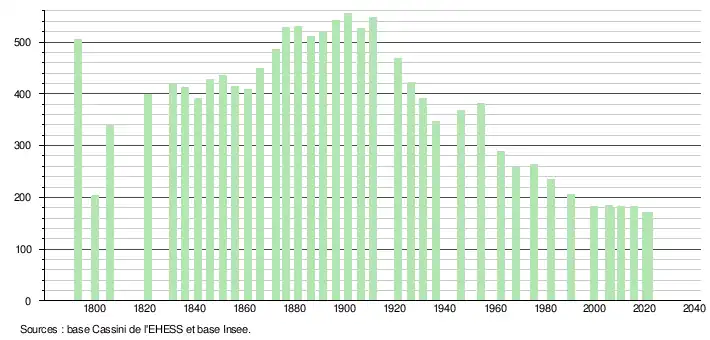 L'évolution du nombre d'habitants est connue à travers les recensements de la population effectués dans la commune depuis 1793. Pour les communes de moins de 10 000 habitants, une enquête de recensement portant sur toute la population est réalisée tous les cinq ans, les populations légales des années intermédiaires étant quant à elles estimées par interpolation ou extrapolation[32]. Pour la commune, le premier recensement exhaustif entrant dans le cadre du nouveau dispositif a été réalisé en 2005[33].