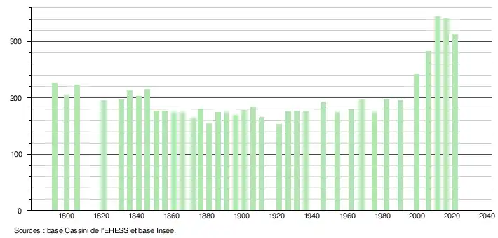 | L'évolution du nombre d'habitants est connue à travers les recensements de la population effectués dans la commune depuis 1793. Pour les communes de moins de 10 000 habitants, une enquête de recensement portant sur toute la population est réalisée tous les cinq ans, les populations légales des années intermédiaires étant quant à elles estimées par interpolation ou extrapolation[25]. Pour la commune, le premier recensement exhaustif entrant dans le cadre du nouveau dispositif a été réalisé en 2006[26]. En 2021, la commune comptait 312 habitants[Note 3], en diminution de 8,77 % par rapport à 2015 (Gironde : +6,88 %, France hors Mayotte : +1,84 %). |