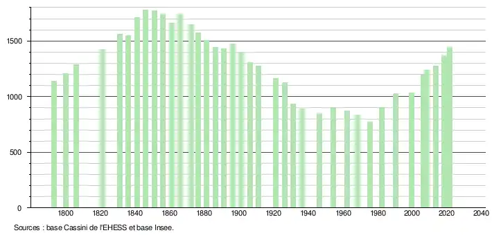 L'évolution du nombre d'habitants est connue à travers les recensements de la population effectués dans la commune depuis 1793. Pour les communes de moins de 10 000 habitants, une enquête de recensement portant sur toute la population est réalisée tous les cinq ans, les populations légales des années intermédiaires étant quant à elles estimées par interpolation ou extrapolation[19]. Pour la commune, le premier recensement exhaustif entrant dans le cadre du nouveau dispositif a été réalisé en 2008[20].