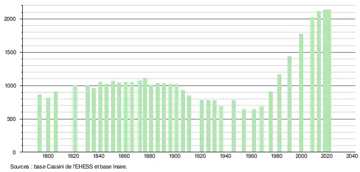 L'évolution du nombre d'habitants est connue à travers les recensements de la population effectués dans la commune depuis 1793. Pour les communes de moins de 10 000 habitants, une enquête de recensement portant sur toute la population est réalisée tous les cinq ans, les populations légales des années intermédiaires étant quant à elles estimées par interpolation ou extrapolation[47]. Pour la commune, le premier recensement exhaustif entrant dans le cadre du nouveau dispositif a été réalisé en 2008[48].