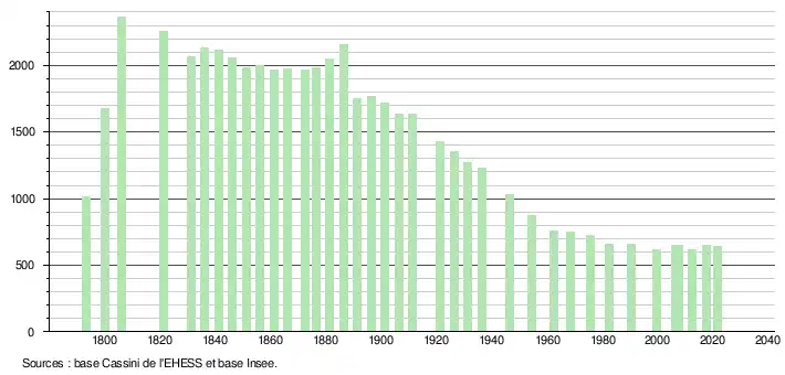 L'évolution du nombre d'habitants est connue à travers les recensements de la population effectués dans la commune depuis 1793. Pour les communes de moins de 10 000 habitants, une enquête de recensement portant sur toute la population est réalisée tous les cinq ans, les populations légales des années intermédiaires étant quant à elles estimées par interpolation ou extrapolation[55]. Pour la commune, le premier recensement exhaustif entrant dans le cadre du nouveau dispositif a été réalisé en 2007[56].