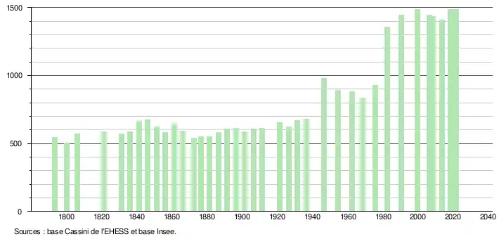 L'évolution du nombre d'habitants est connue à travers les recensements de la population effectués dans la commune depuis 1793. Pour les communes de moins de 10 000 habitants, une enquête de recensement portant sur toute la population est réalisée tous les cinq ans, les populations légales des années intermédiaires étant quant à elles estimées par interpolation ou extrapolation[29]. Pour la commune, le premier recensement exhaustif entrant dans le cadre du nouveau dispositif a été réalisé en 2008[30].