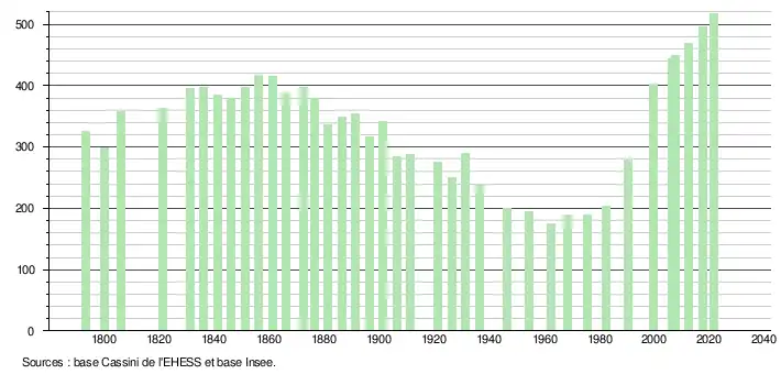 L'évolution du nombre d'habitants est connue à travers les recensements de la population effectués dans la commune depuis 1793. Pour les communes de moins de 10 000 habitants, une enquête de recensement portant sur toute la population est réalisée tous les cinq ans, les populations légales des années intermédiaires étant quant à elles estimées par interpolation ou extrapolation[29]. Pour la commune, le premier recensement exhaustif entrant dans le cadre du nouveau dispositif a été réalisé en 2007[30].