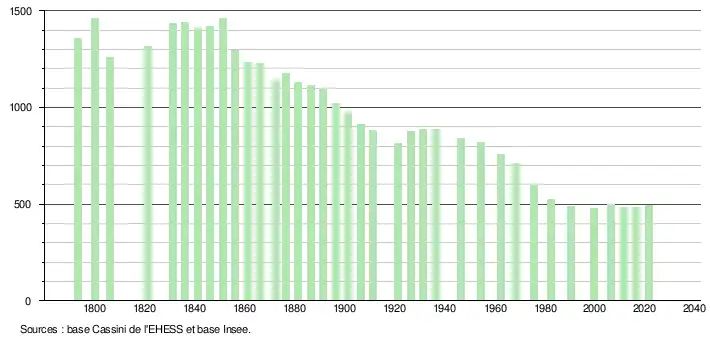 L'évolution du nombre d'habitants est connue à travers les recensements de la population effectués dans la commune depuis 1793. Pour les communes de moins de 10 000 habitants, une enquête de recensement portant sur toute la population est réalisée tous les cinq ans, les populations légales des années intermédiaires étant quant à elles estimées par interpolation ou extrapolation[25]. Pour la commune, le premier recensement exhaustif entrant dans le cadre du nouveau dispositif a été réalisé en 2006[26].