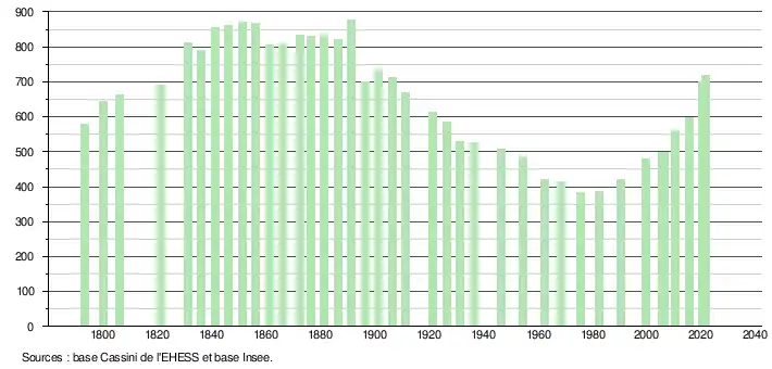 | L'évolution du nombre d'habitants est connue à travers les recensements de la population effectués dans la commune depuis 1793. Pour les communes de moins de 10 000 habitants, une enquête de recensement portant sur toute la population est réalisée tous les cinq ans, les populations légales des années intermédiaires étant quant à elles estimées par interpolation ou extrapolation[27]. Pour la commune, le premier recensement exhaustif entrant dans le cadre du nouveau dispositif a été réalisé en 2005[28]. En 2021, la commune comptait 717 habitants[Note 4], en augmentation de 19,9 % par rapport à 2015 (Landes : +4,9 %, France hors Mayotte : +1,84 %). |